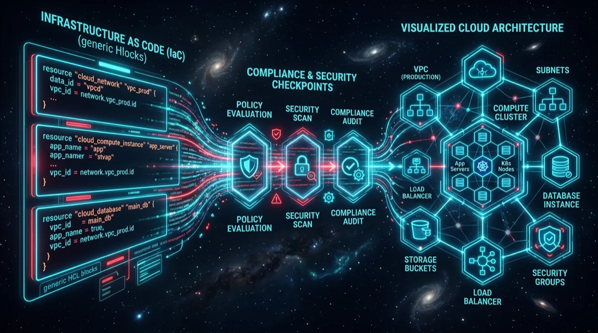 Before any Terraform plan reaches apply, compliance scanning runs against the configuration: