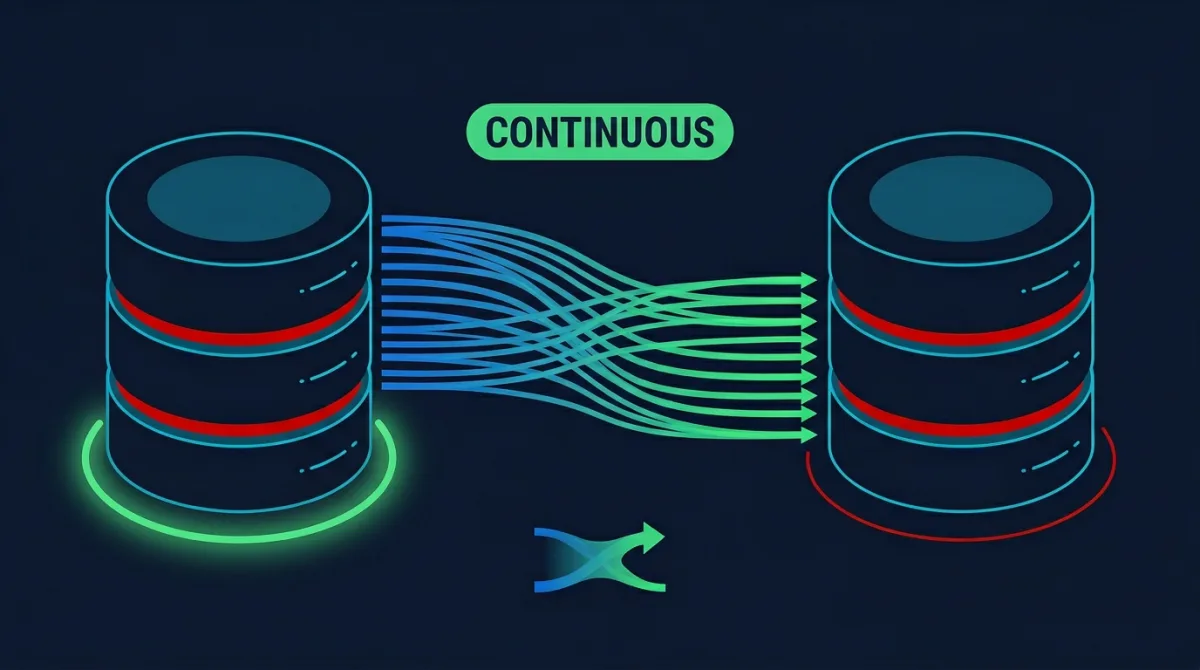 } The full-load-and-cdc migration type performs an initial full copy, then switches to change data capture (CDC) for ongoing replication. Once replication lag drops to zero, the cutover is a DNS change or connection string update — typically under one second of effective downtime.