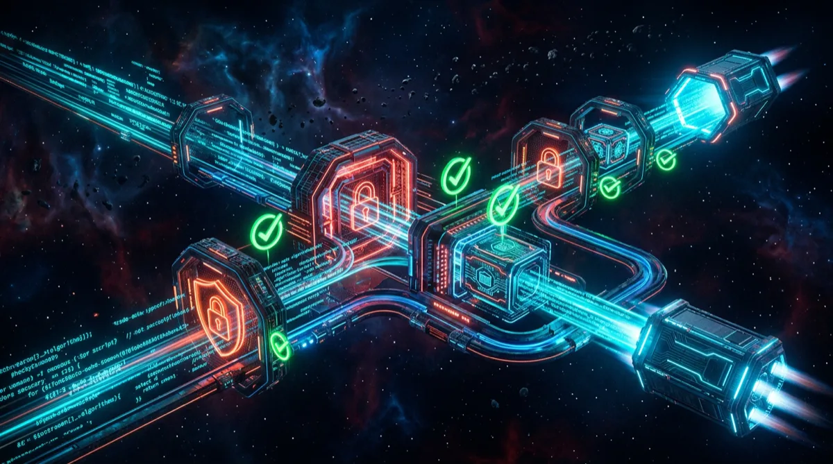 The pipeline is where security gates live. Every merge to a protected branch triggers:
