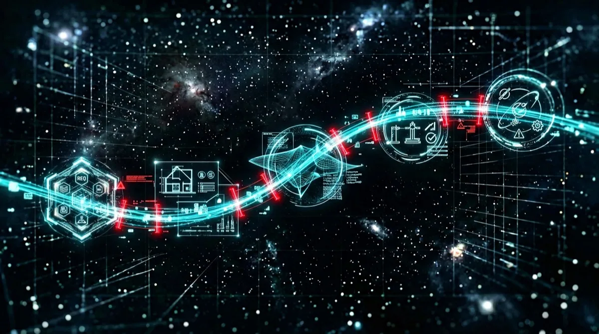 A digital thread is a connected flow of data across the program lifecycle — from requirements through design, implementation, test, and operations. In a fully realized digital thread: