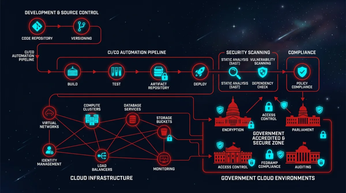 - Continuous monitoring: Pipeline-generated evidence (scan artifacts, deployment manifests, signed image digests) provides the evidence stream for cATO frameworks.